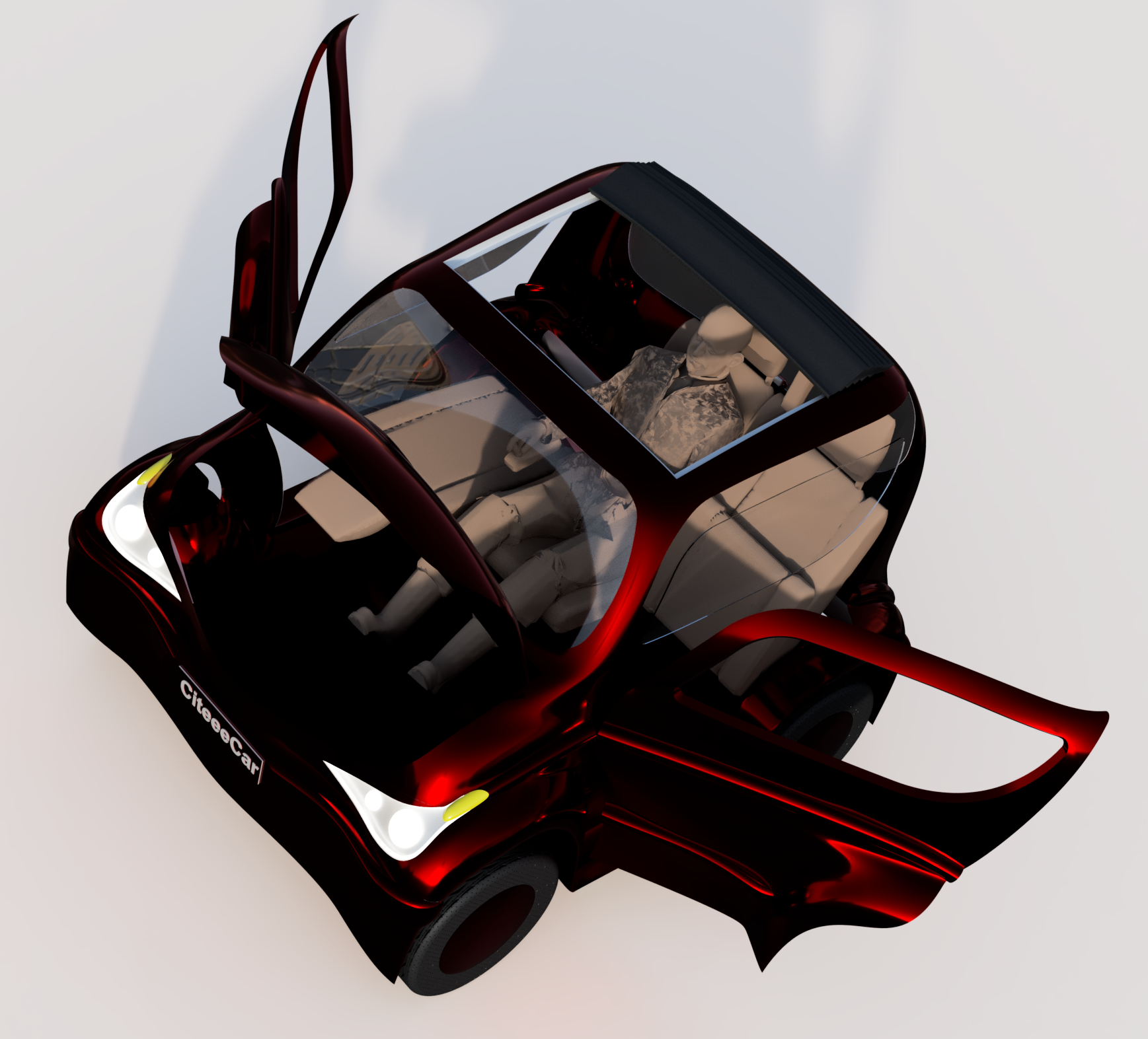 An electric 3 seater, with joystick, proposing a new manufacturing concept: hot liquid thermoforming. Our electric city car, the citeeecar.com project, steered with a joy stick, is torque vectoring, yet it offeres more space between driver’s eye to windshield than a Rolls Royce, and includes a new system of red light communication to indicate and react to the green phases. |